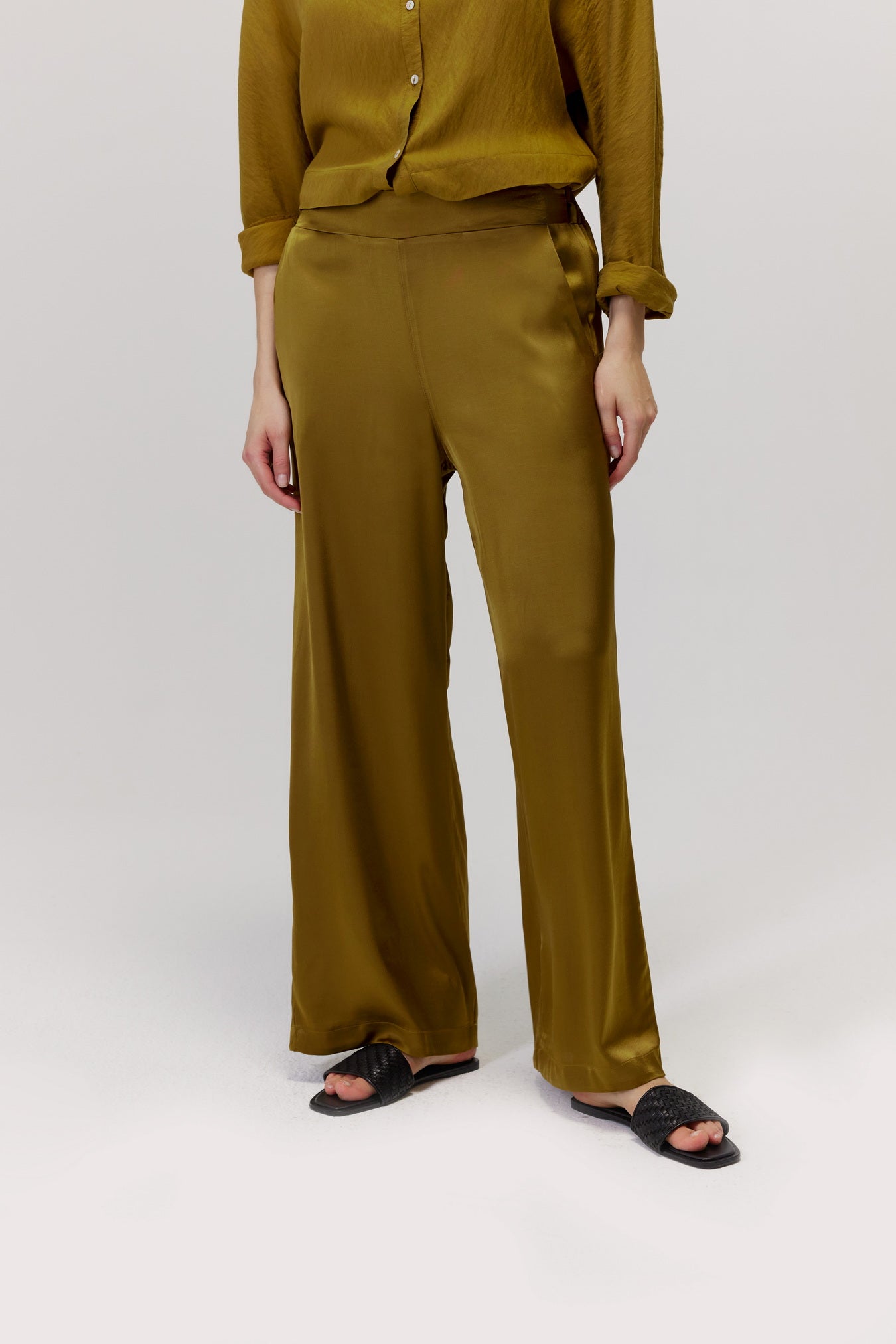 Dzięki szerokim nogawkom i płynnemu, lekkiemu materiałowi, spodnie miękko układają się przy każdym ruchu, tworząc efekt wysmuklonej, zrównoważonej sylwetki;