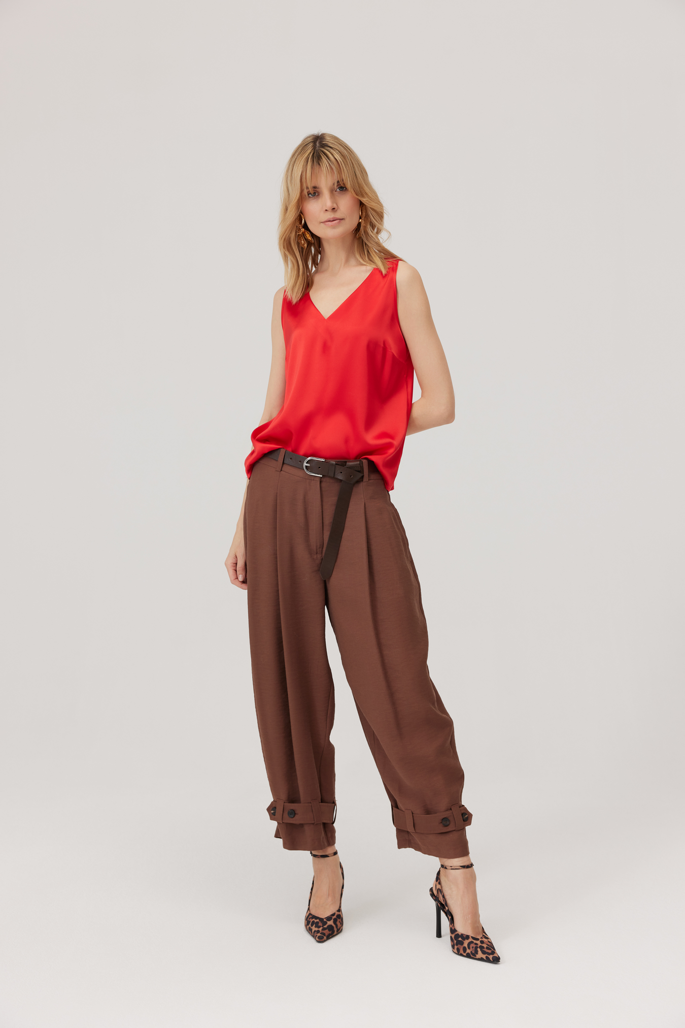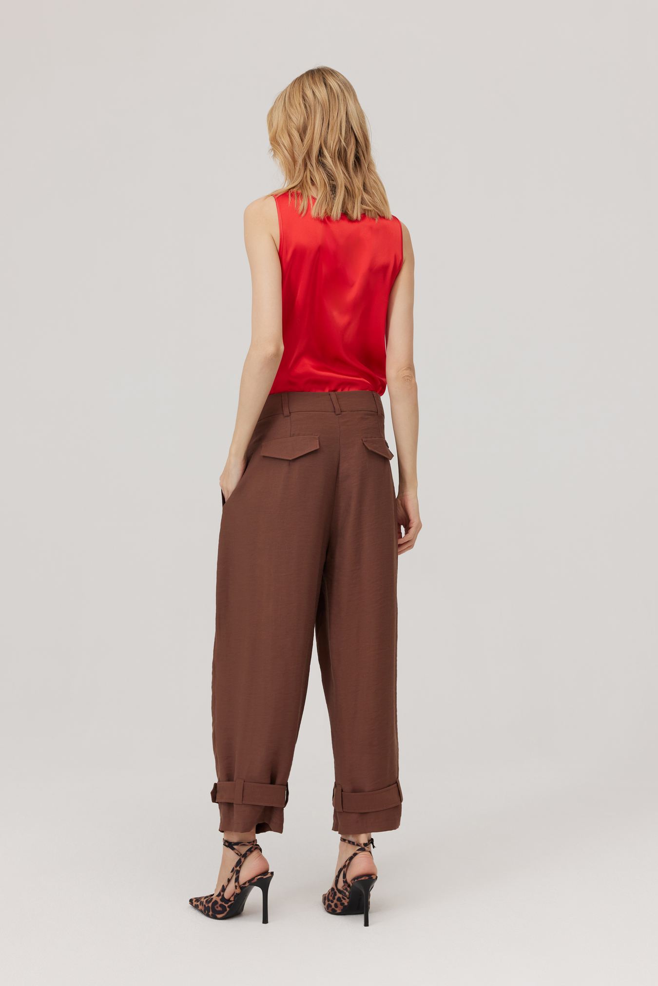 Talia wykończona pasem ze szlufkami i zapięciem na guzik. Kieszenie ukryte w szwach, z tyłu patki zamiast klasycznych kieszeni. Przy dole nogawek znajdują się paski zapinane na dwa guziki — mogą delikatnie zebrać nogawkę lub zostawić ją bardziej otwartą. Wystarczy prosty top lub koszula, by stworzyć gotową stylizację