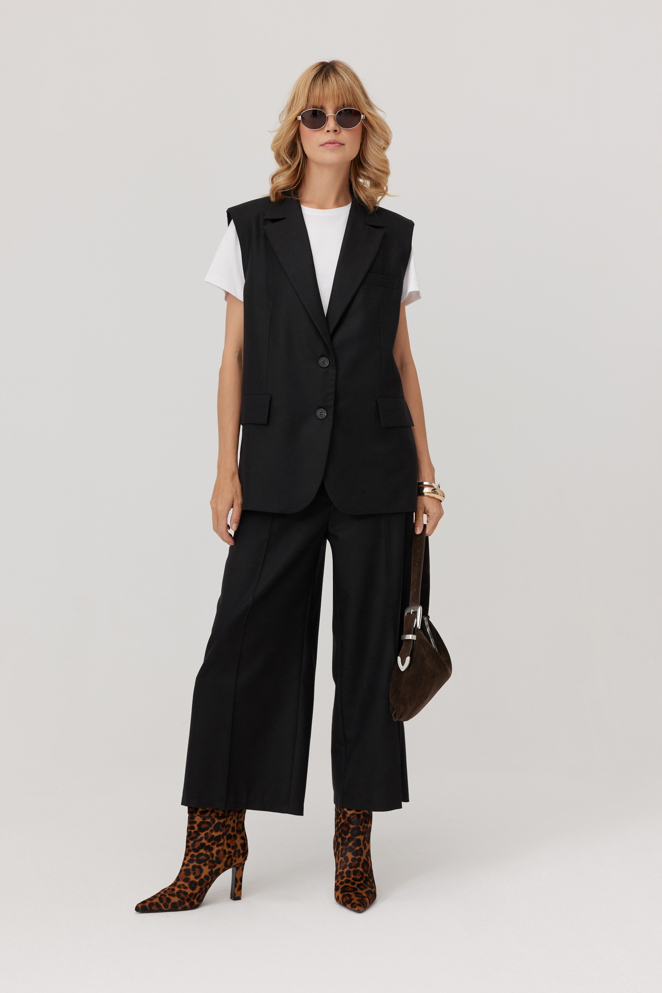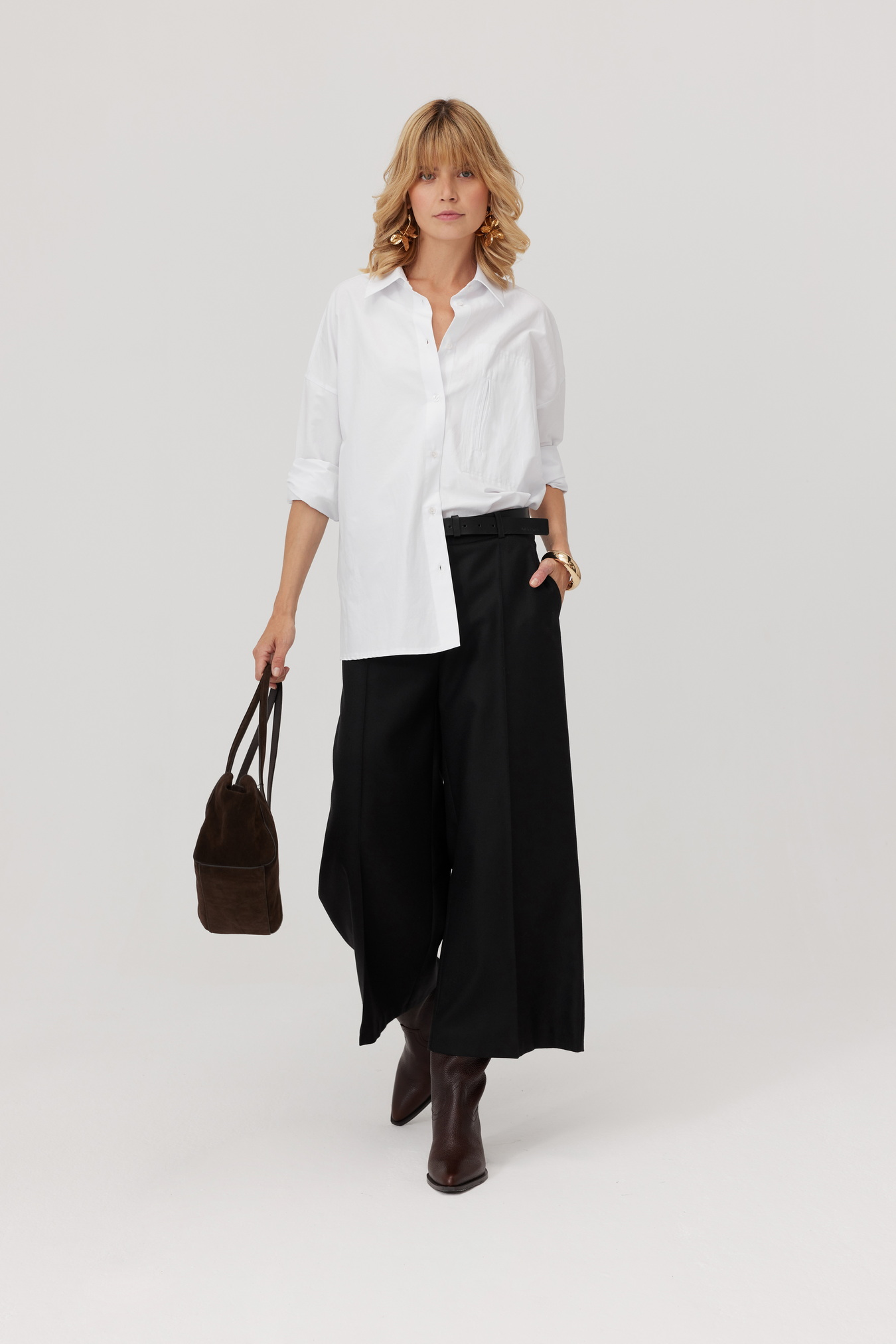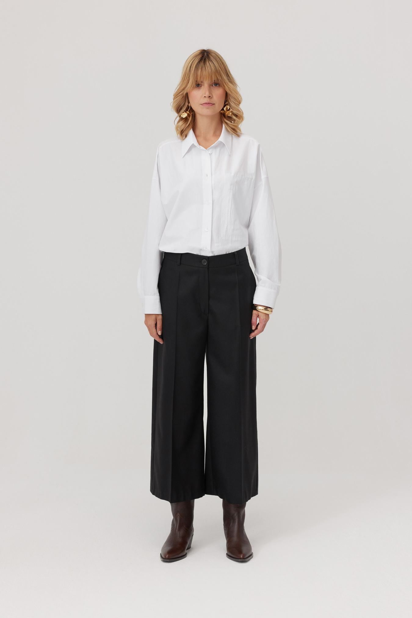Zapisz się do newslettera i zyskaj 10% rabatu na zakupySpodnie Lano to eleganckie spodnie damskie z szerokimi prostymi nogawkami 7/8, wykonane z lekko sztywnej tkaniny wełnianej. Mają klasyczny pas ze szlufkami, boczne kieszenie i zarysowany kant, przez co świetnie wydłużają i wysmuklają nogi. To uniwersalny fason do pracy, codziennych stylizacji i biznesowych zestawów – doskonałe jako minimalistyczne, eleganckie spodnie damskie