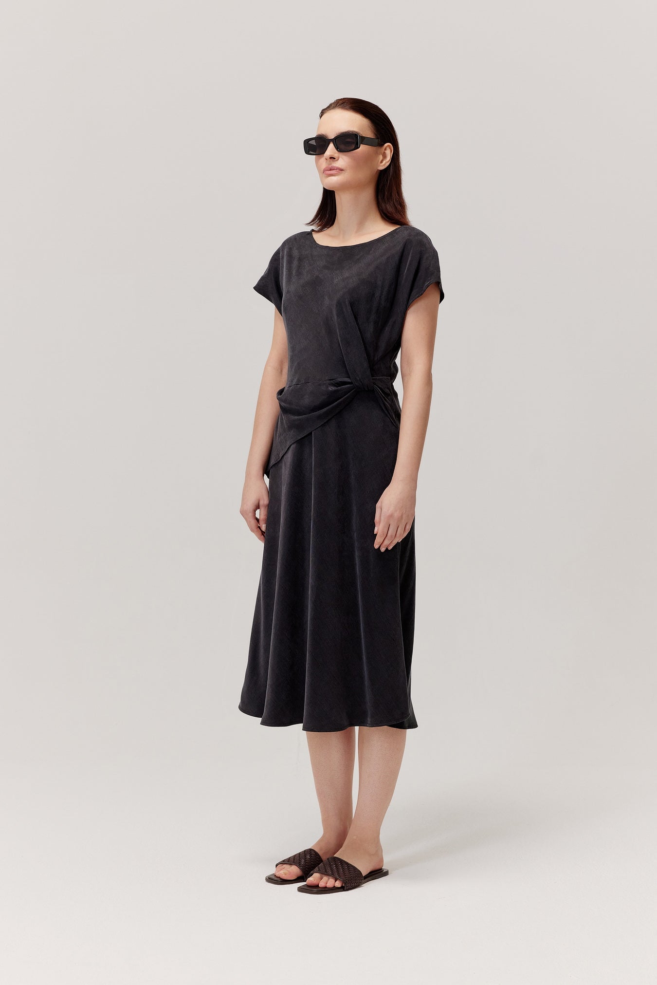 - luźny krój midi z efektownym wiązaniem w talii;