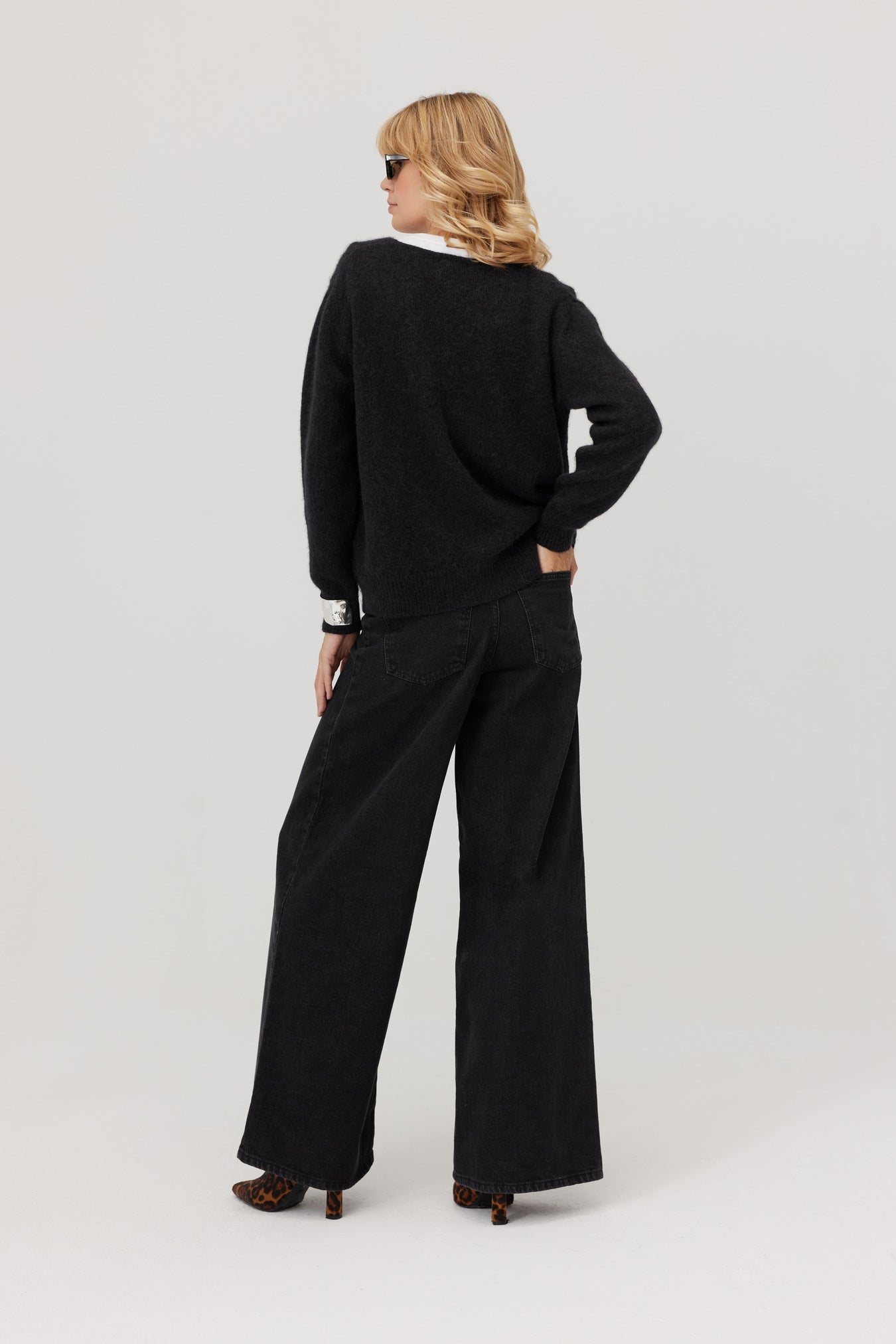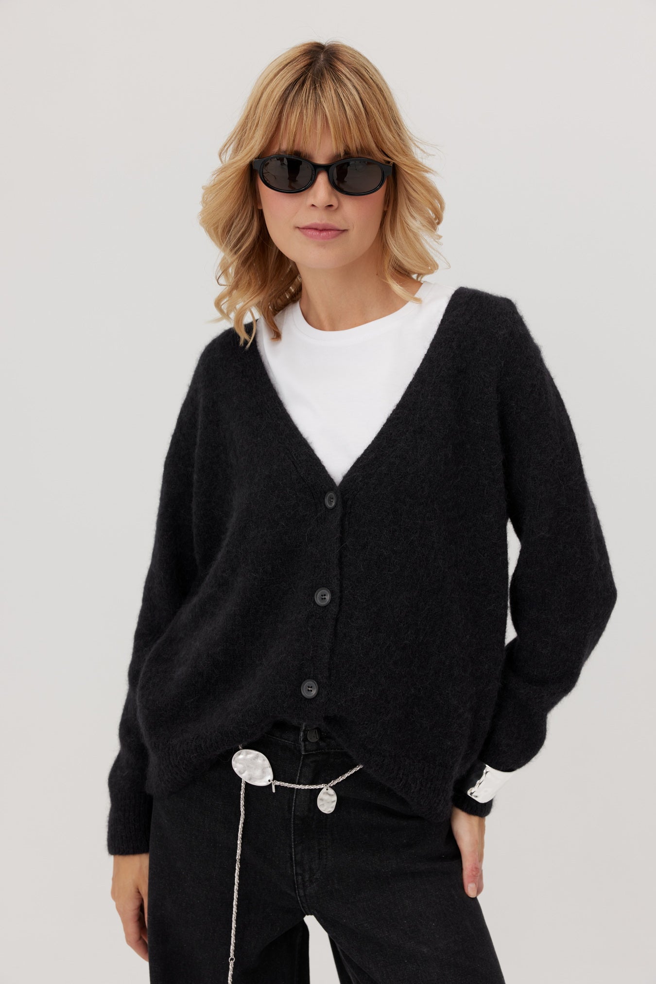 Zapisz się do newslettera i zyskaj 10% rabatu na zakupyCzarny kardigan Blanc to klasyczny sweter wykonany z naturalnej przędzy łączącej miękką alpakę z wysokiej jakości wełną. Model wyróżnia się głębokim dekoltem w kształcie litery V, który doskonale komponuje się zarówno z T-shirtem, jak i elegancką koszulą. Kardigan posiada praktyczne zapięcie na guziki oraz długie rękawy, a jego luźny fason sprawia, że sprawdza się w różnorodnych stylizacjach – od casualowych po biznesowe. To kardigan, który posłuży Ci przez wiele sezonów.