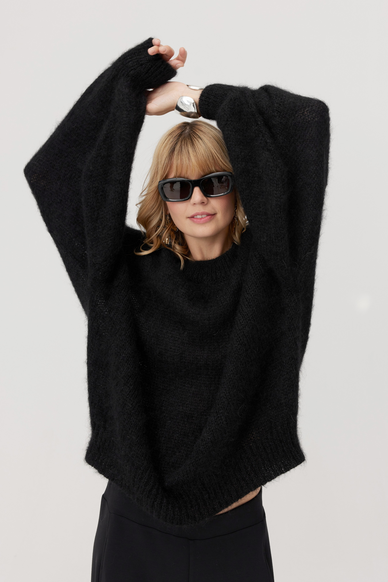 Ten model swetra stworzyliśmy w klasycznym czarnym kolorze. Jest to fason oversize, który pasuje do wielu sylwetek i gwarantuje wygodę noszenia. Rękawy to jego atut - mega luźne, finezyjnie wplecione reglanem. Całość swobodnie, miękko otula sylwetkę.