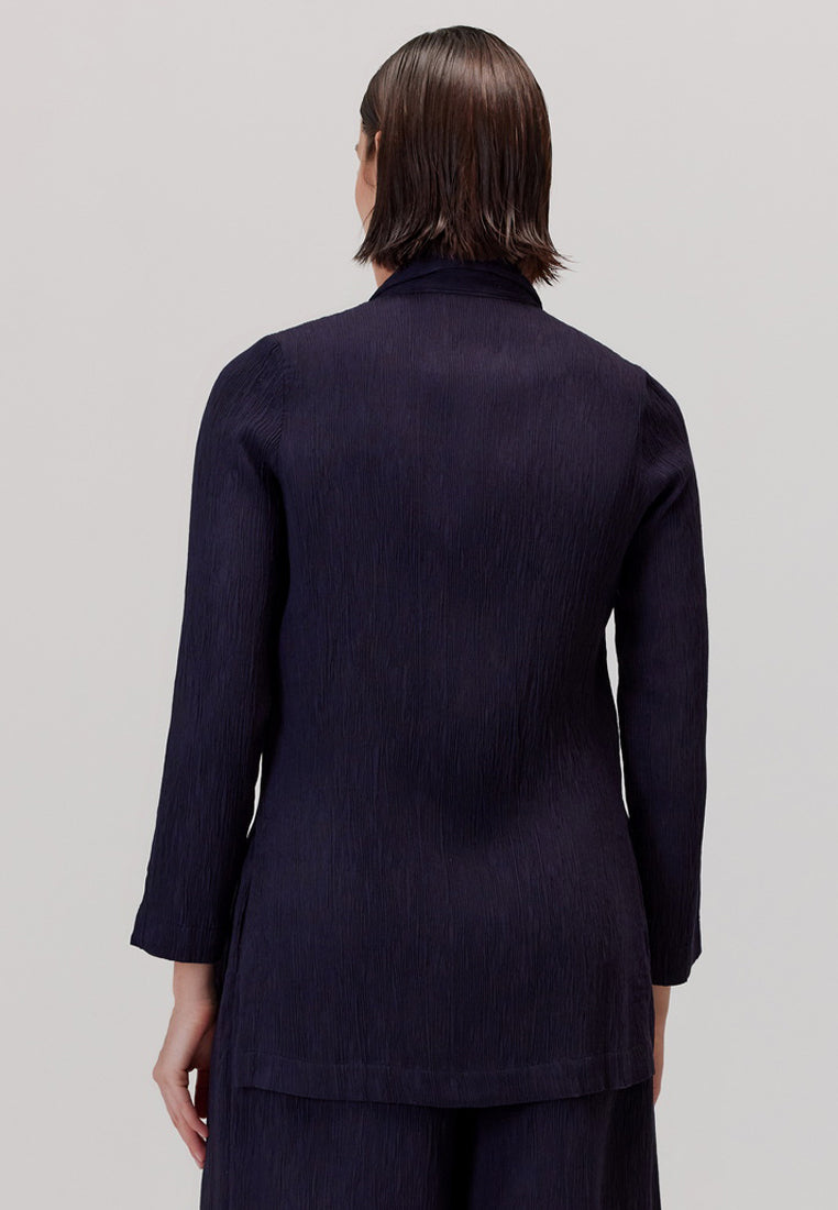 - Długość sięgająca bioder nadaje sylwetce lekkości, a zapięcie na jeden kontrastowy guzik pozwala zachować czystą linię przodu;