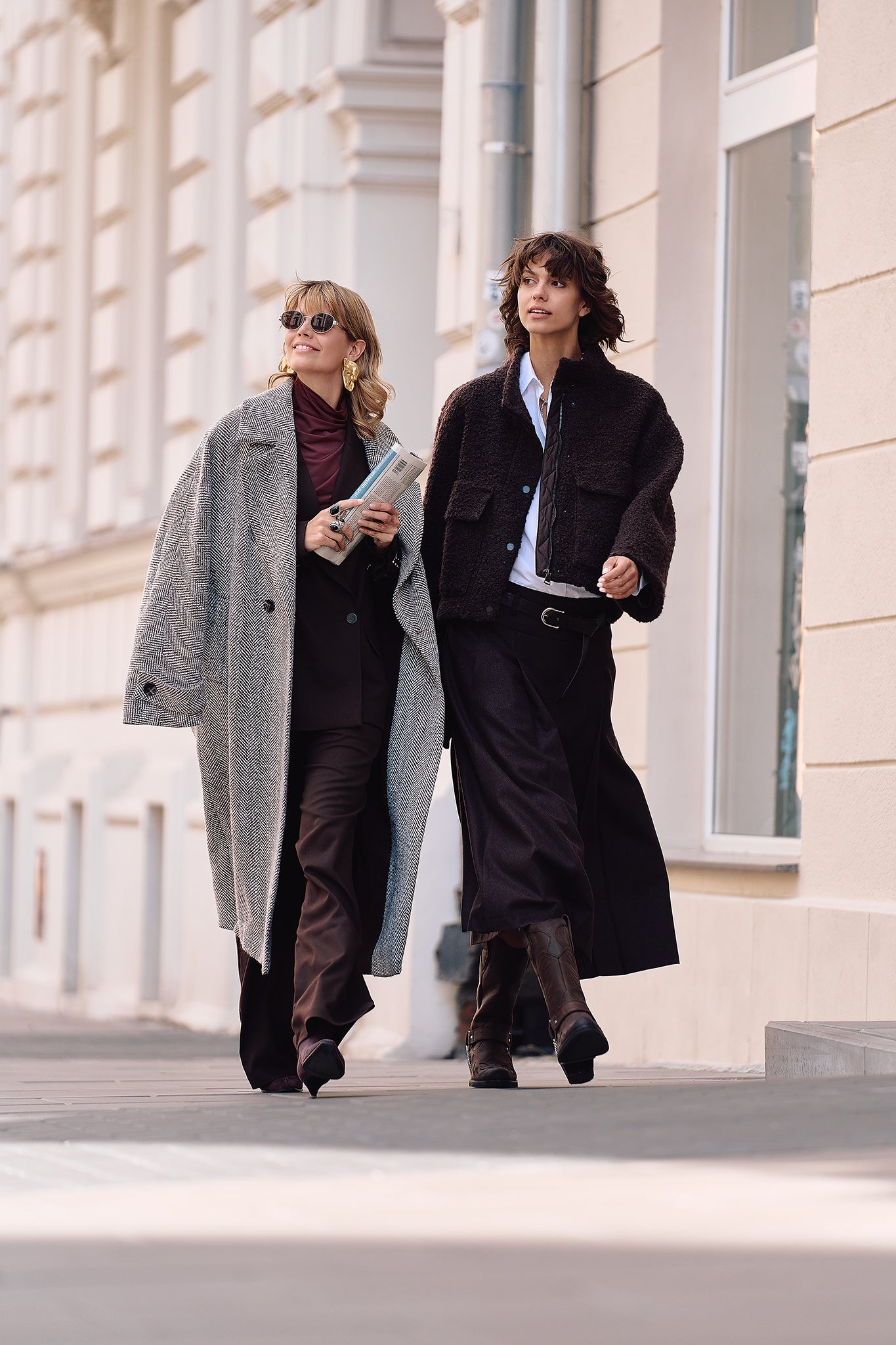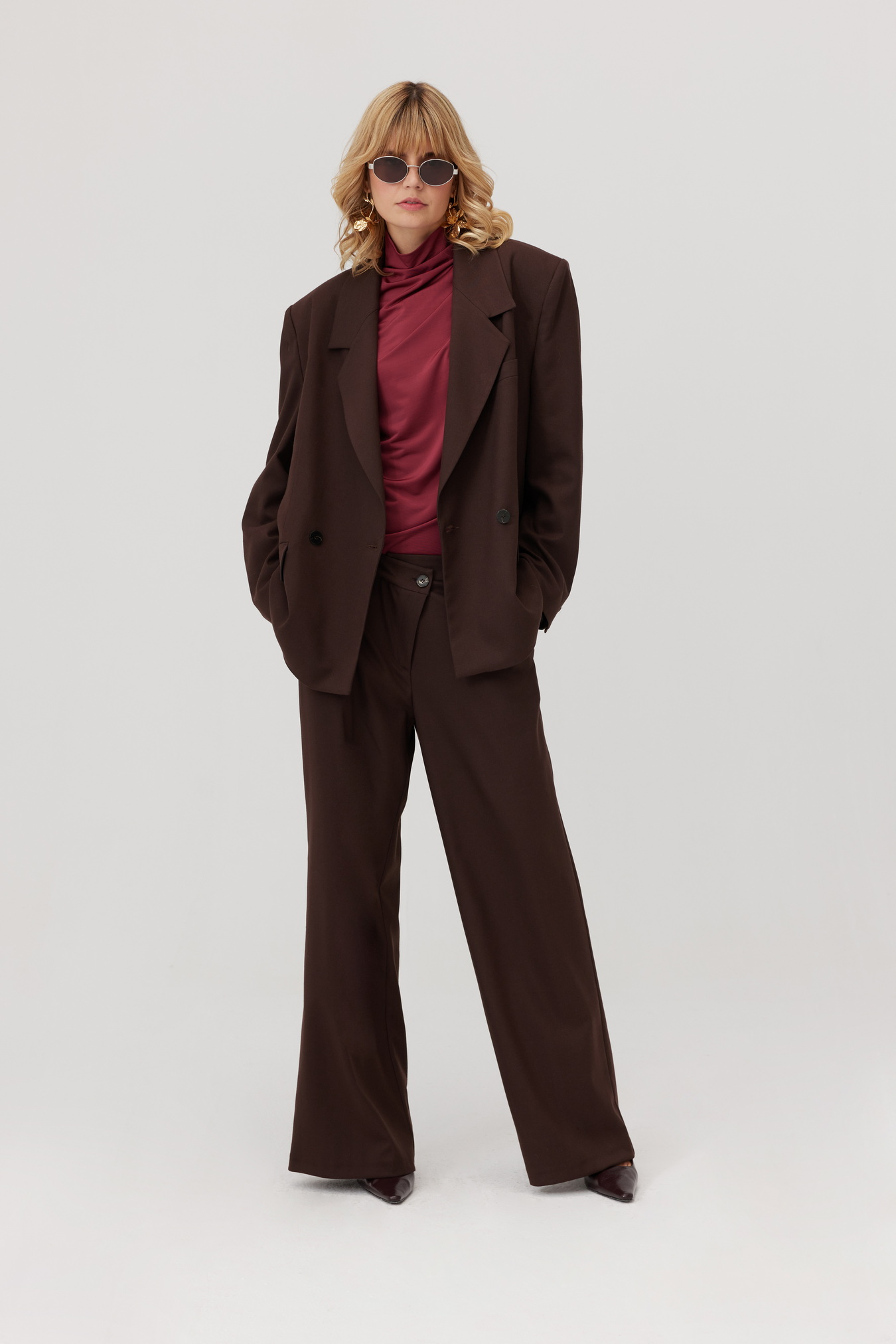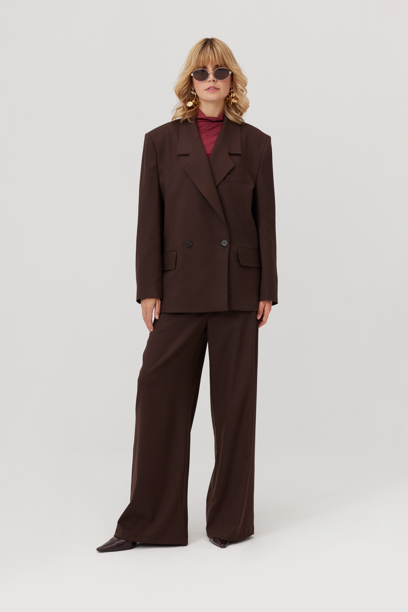 Luźny żakiet dwurzędowy o fasonie oversize i szerokich ramionach to modny wybór dla kobiet ceniących komfort oraz wyrazisty styl. Inspirowany męską klasyką, wpisuje się w najnowsze trendy miejskiej elegancji. Szerokie klapy, obniżona linia ramion i lekko wydłużony krój sprawiają, że sylwetka nabiera charakteru. Dwurzędowe zapięcie na guziki, kieszenie z patkami i rozcięcie z tyłu zapewniają wygodę. Żakiet wykonany jest z przewiewnej, trwałej poliwiskozy, która dobrze układa się na sylwetce i łatwo pielęgnuje. Doskonale prezentuje się z szerokimi spodniami Evans z tej samej lini. Świetny zarówno do biura, jak i w codziennych stylizacjach