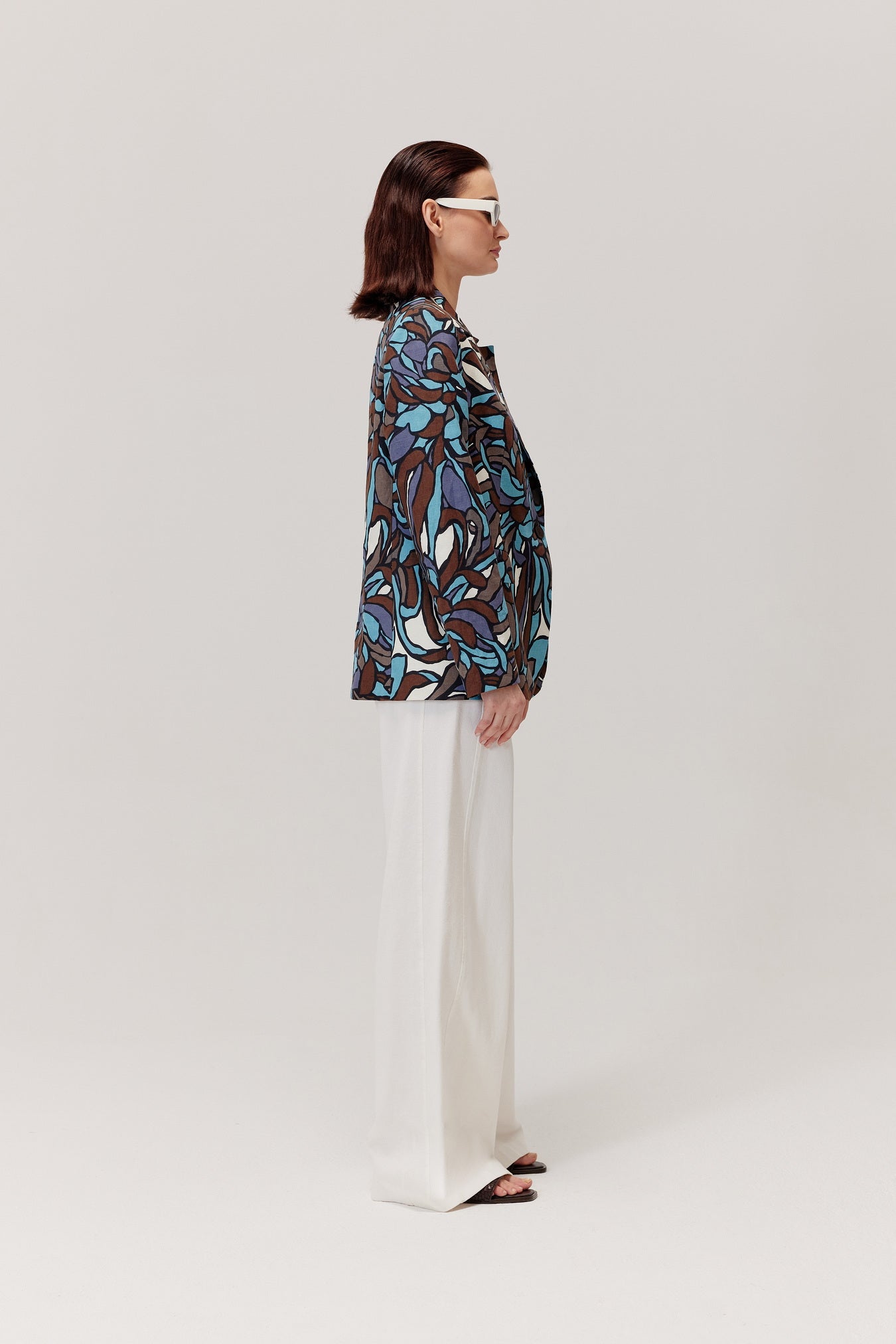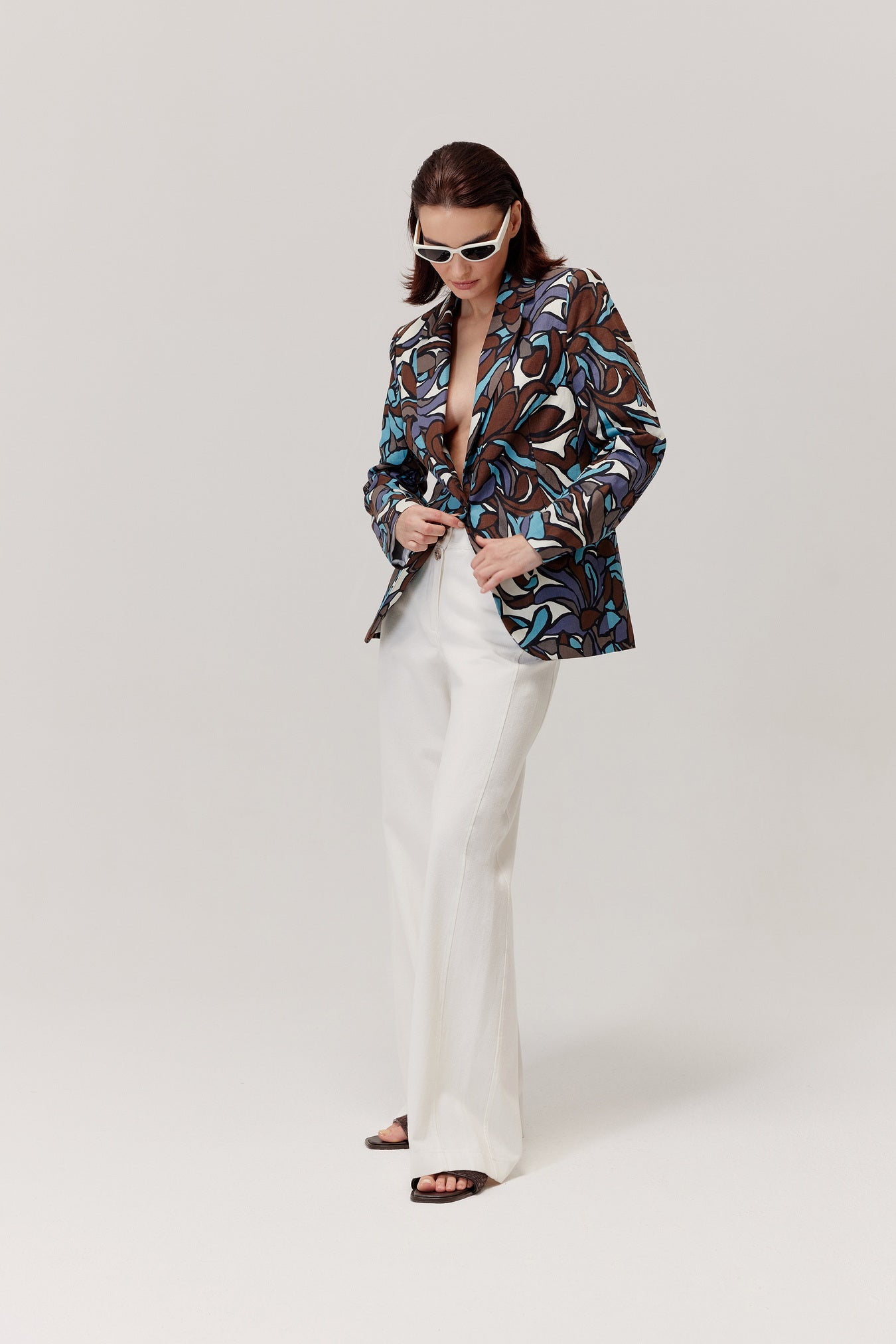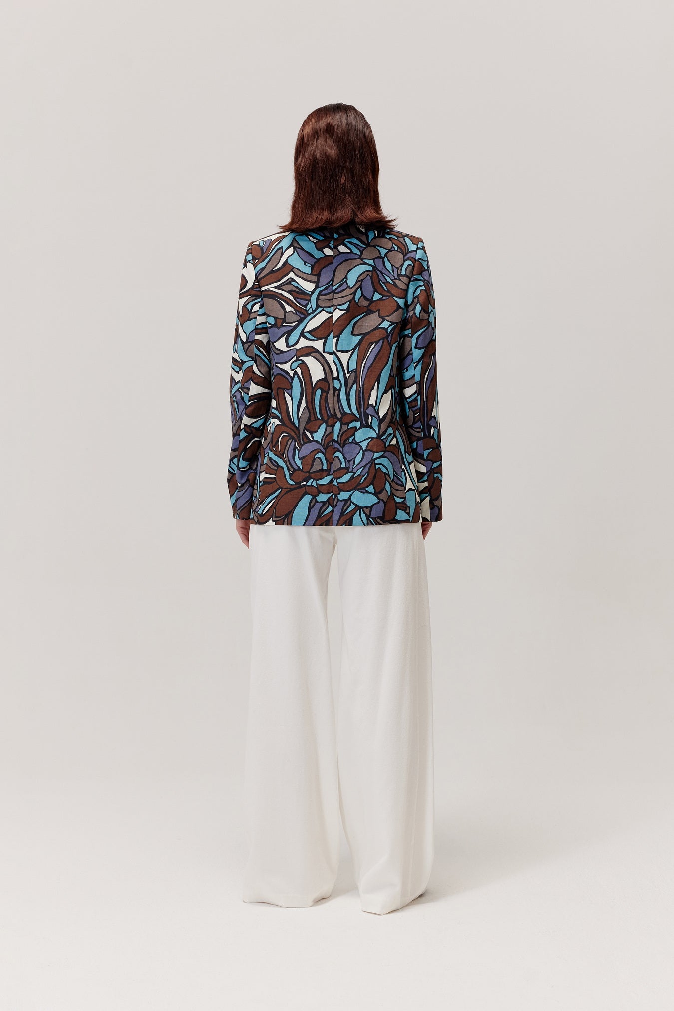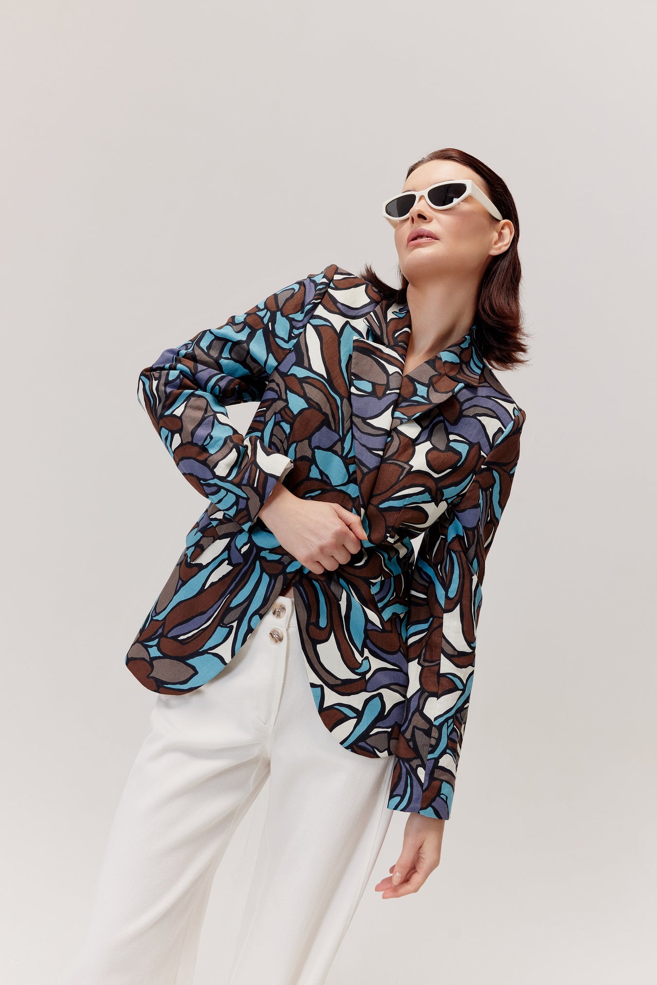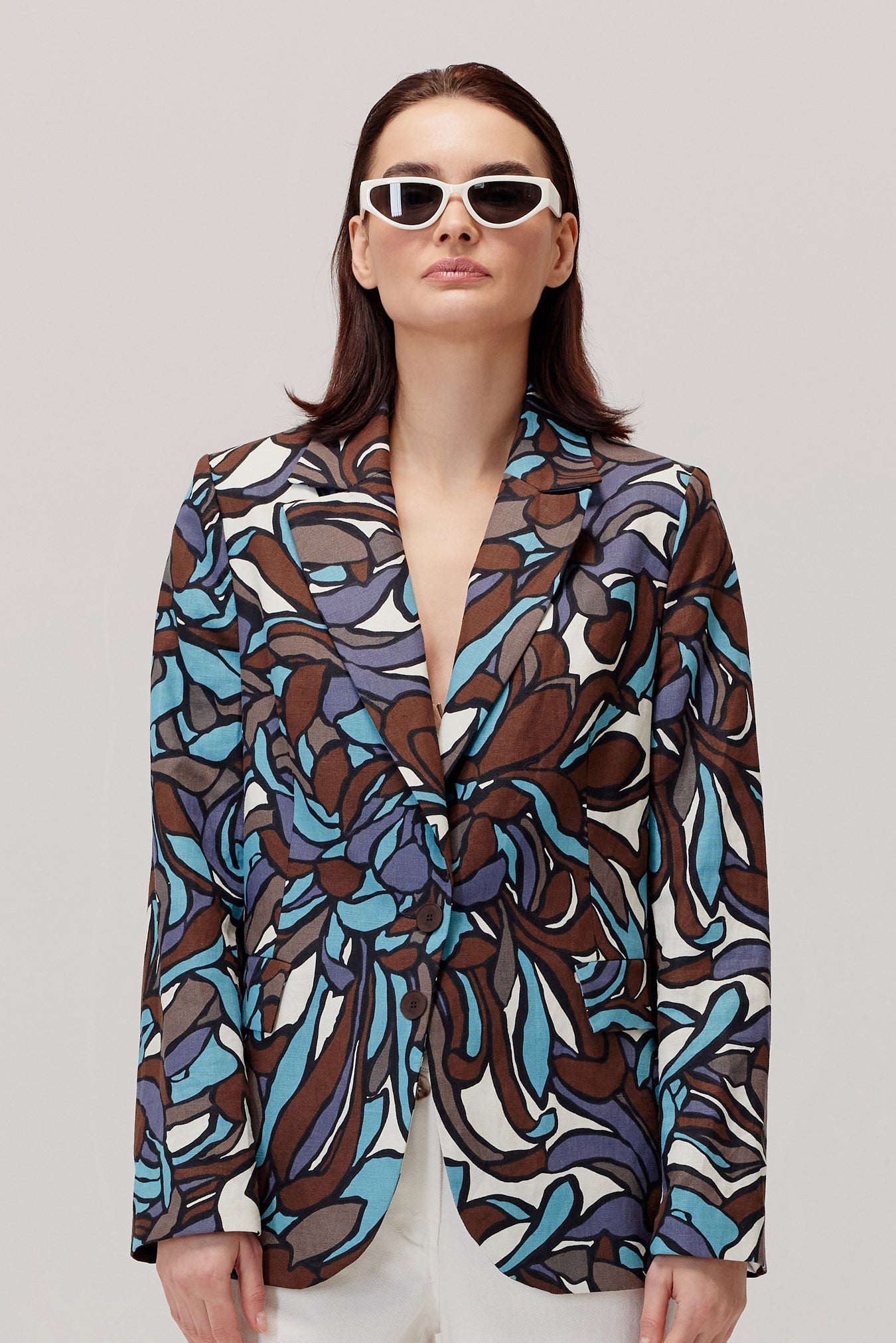 - Żakiet Faber to mariaż klasycznej formy z artystyczną ekspresją – jego dopasowany krój subtelnie modeluje sylwetkę, a intensywny wzór przyciąga uwagę i nadaje stylizacji charakteru;
