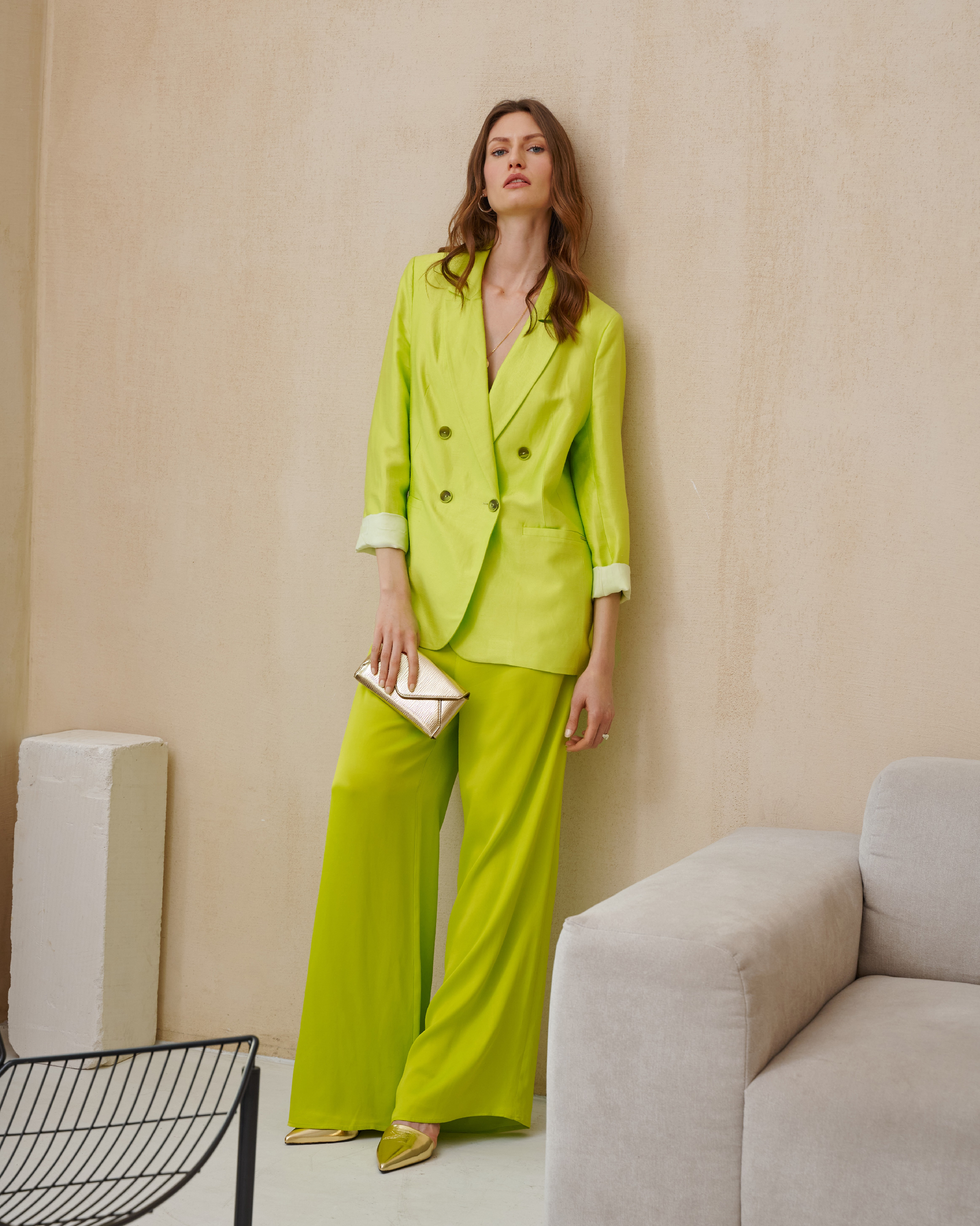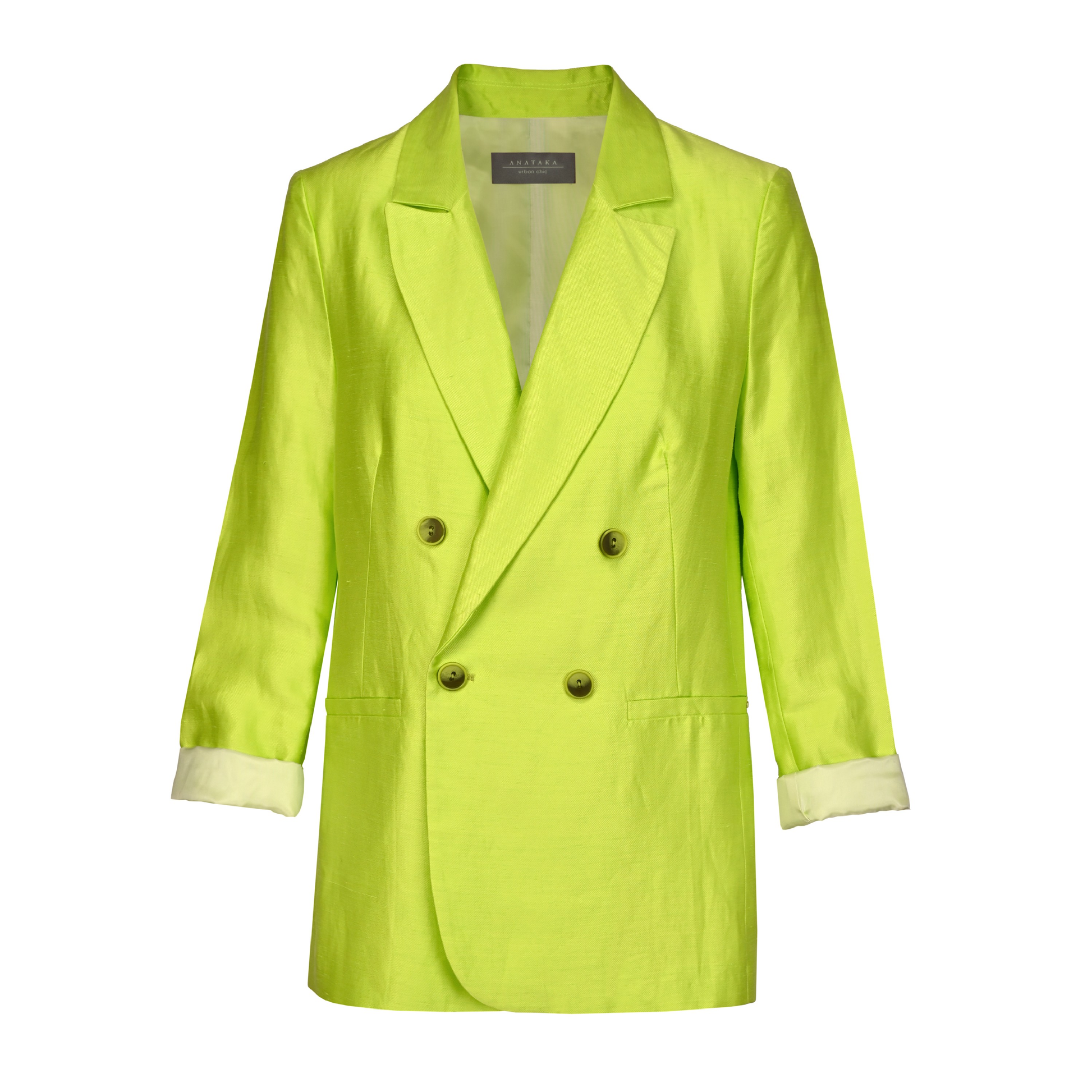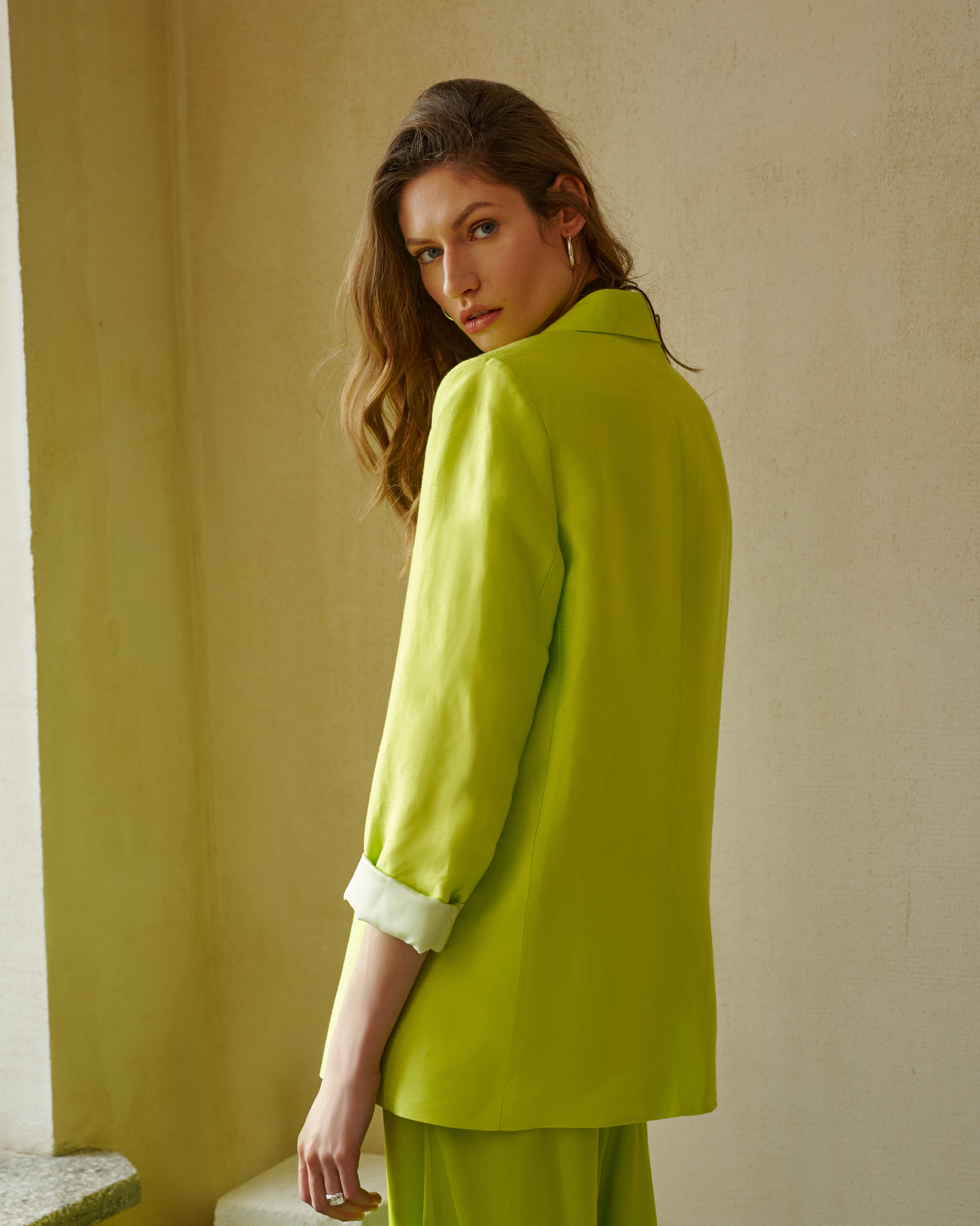 Zapisz się do newslettera i zyskaj 10% rabatu na zakupyEnergetyzujący, wiskozowo-lniany żakiet w kolorze neonowej limonki. Model prostej swobodnej marynarki o rewersowym kołnierzu oraz dwurzędowym zapięciu na kolorystycznie wkomponowane guziki. Na wysokości bioder dodaliśmy wygodne, wpuszczone kieszenie. Rękawy długie z opcją wywinięcia. Całość na tonowo dobranej podszewce.
