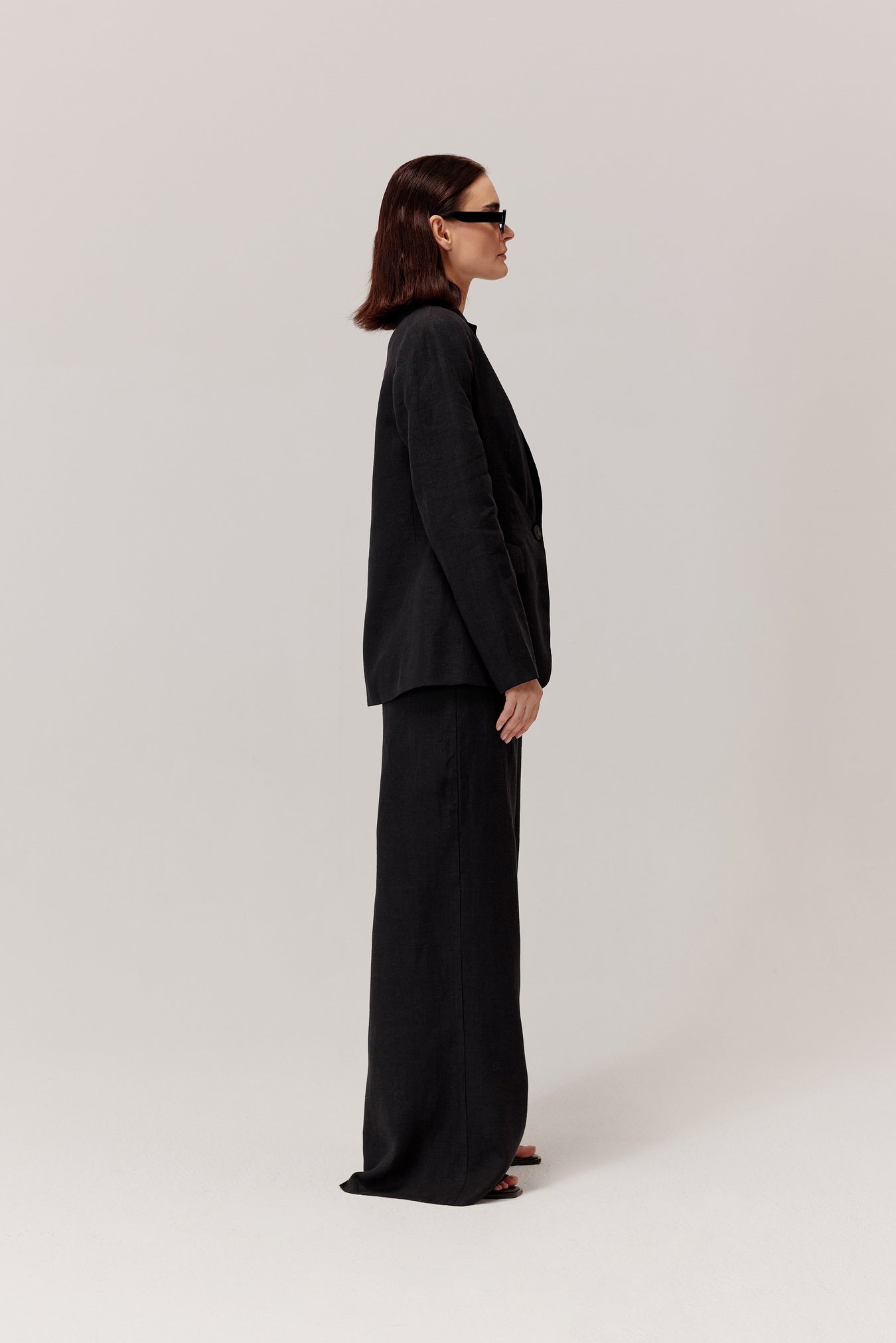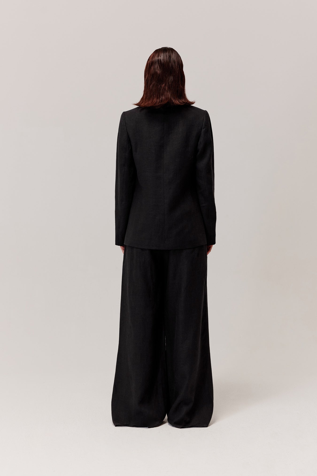 - Profilujące szwy delikatnie rzeźbią sylwetkę, nie zaburzając przy tym naturalnego luzu charakterystycznego dla tkanin lnianych.